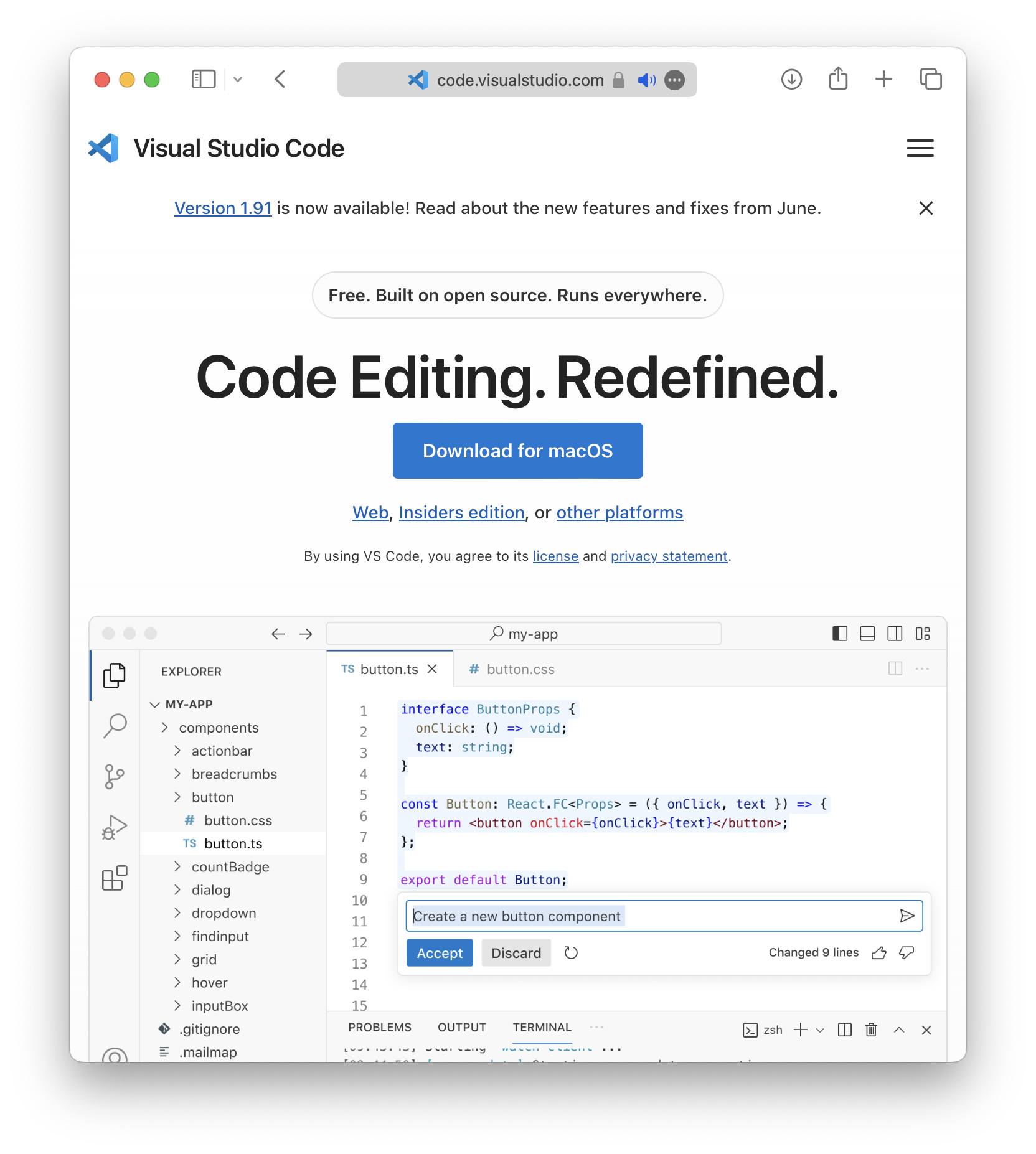 从官方网站Visual Studio Code下载最新版 Visual Studio Code,单击按钮下载并安装。具体地,将图标拖到“应用程序”文件夹下面。