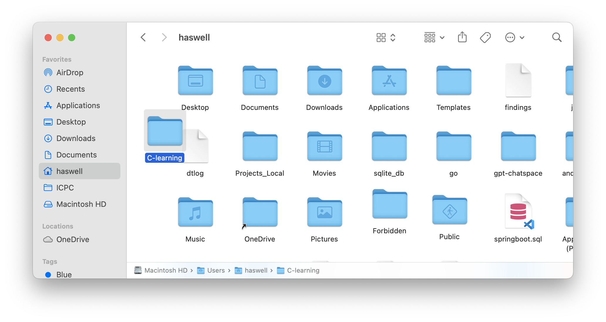 回到访达,创建专用于 C 语言练习的工作文件夹,我选择的路径是