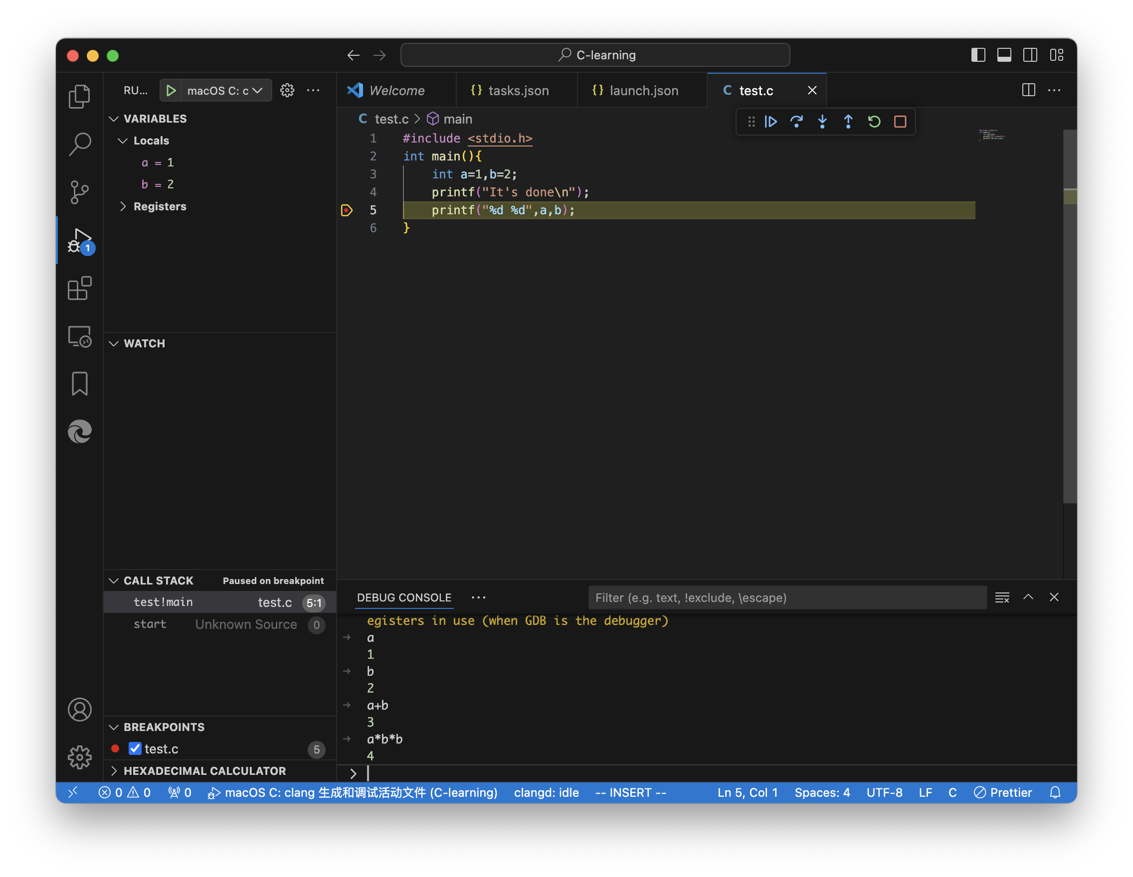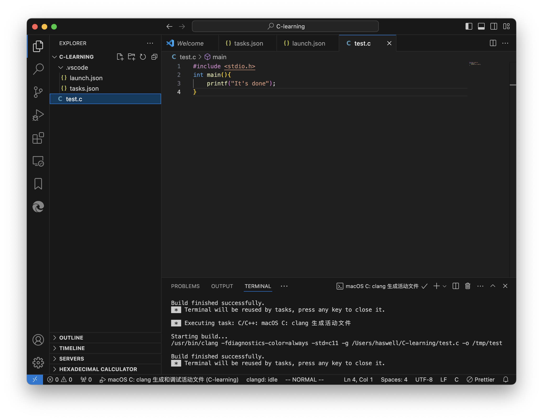 这样,我们就可以简单地编译、调试 C 源代码了,我们在 C-learning(注意不是刚才的.vscode)下创建源代码 test.c